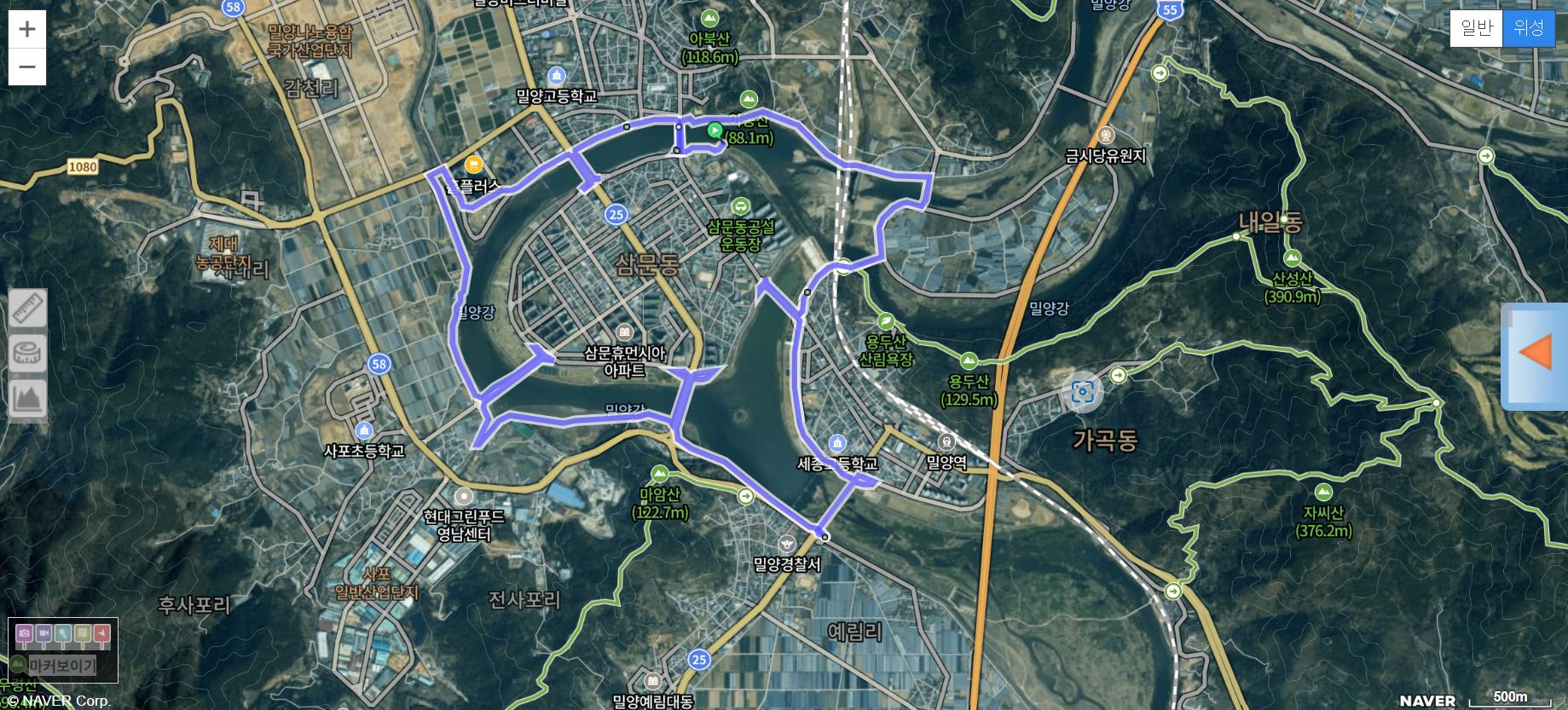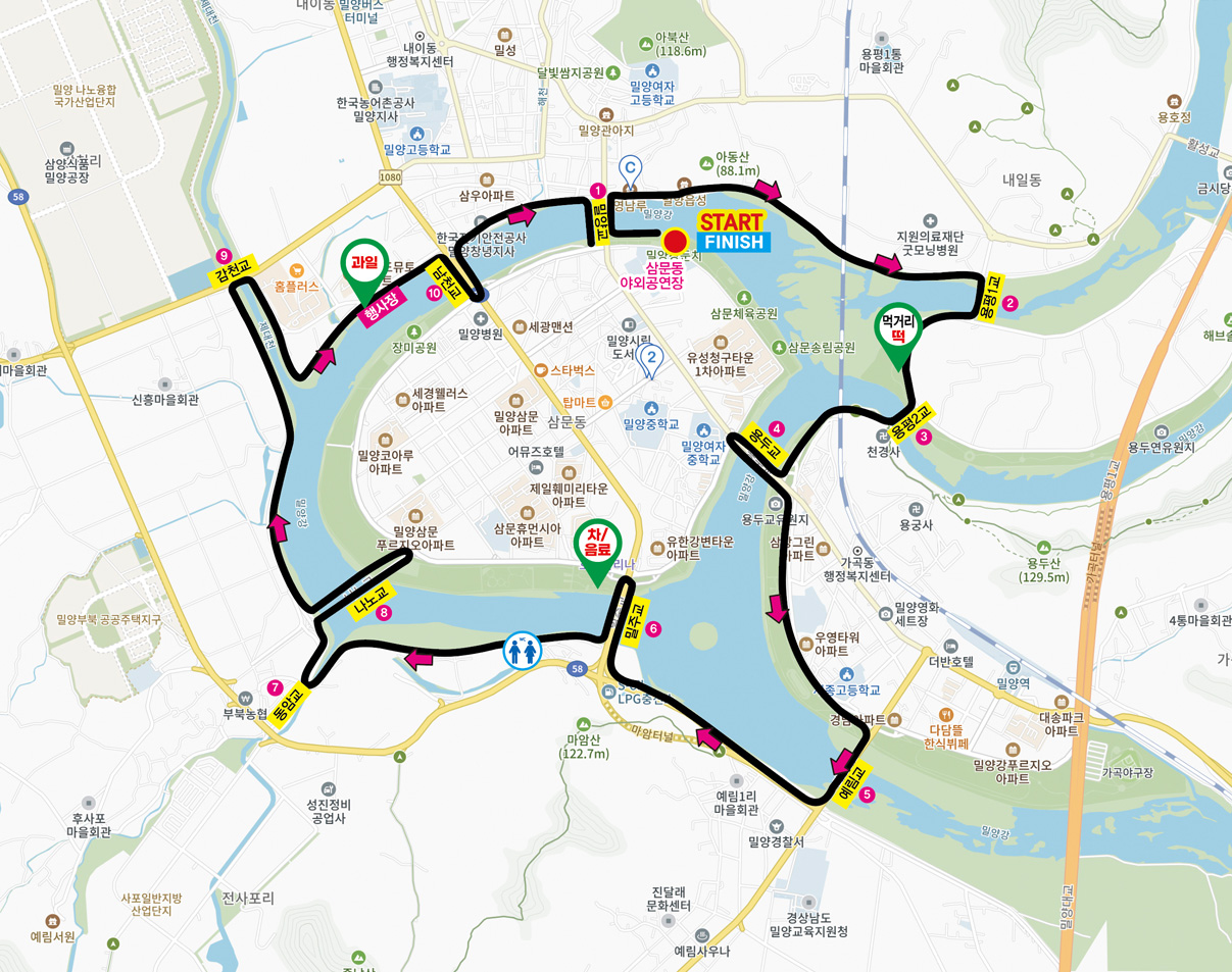출발 : 야외공연장 → 밀양교(渡橋, 往) → 영남루아랫길 → 밀양강강변제방벚꽃길(우안) → 경부선철교(하) → 용평1교(渡橋) → 용평로 → 용평2교(渡橋) → 경부선철교(하) → 가곡강변주차창 → 용두교(渡橋, 往) → 용두교(하) → 용두교(渡橋, 復) → 가곡강변로 → 예림교(하) → 예림교(渡橋) → 양림간(휴식) → 예림교(하) → 밀양대로 → 마암교차로 → 밀주교(渡橋, 往) → 밀주교(하) → 밀주교(渡橋, 復) →밀양강강변산책로(우안) → 동암교(渡橋, 往) → 동암교차로 → 나노교 (渡橋, 往) → 나노교(하) → (밀양강변체육공원) → 나노교(좌) → 밀양강강변산책로(우안) → 제대천천변산책로(우안) → 감천교(渡橋, 점필재로) → 제대천천변산책로(좌안) → 밀양강강변로(우안)→ 남천교(渡橋, 往) → 남천교(하) → 남천교(渡橋, 復) → 밀양강남천강변로(우안) → 밀양교(渡橋, 復) → 중앙로→ 밀양교(하) → 밀양강오리배선착장 : 해산