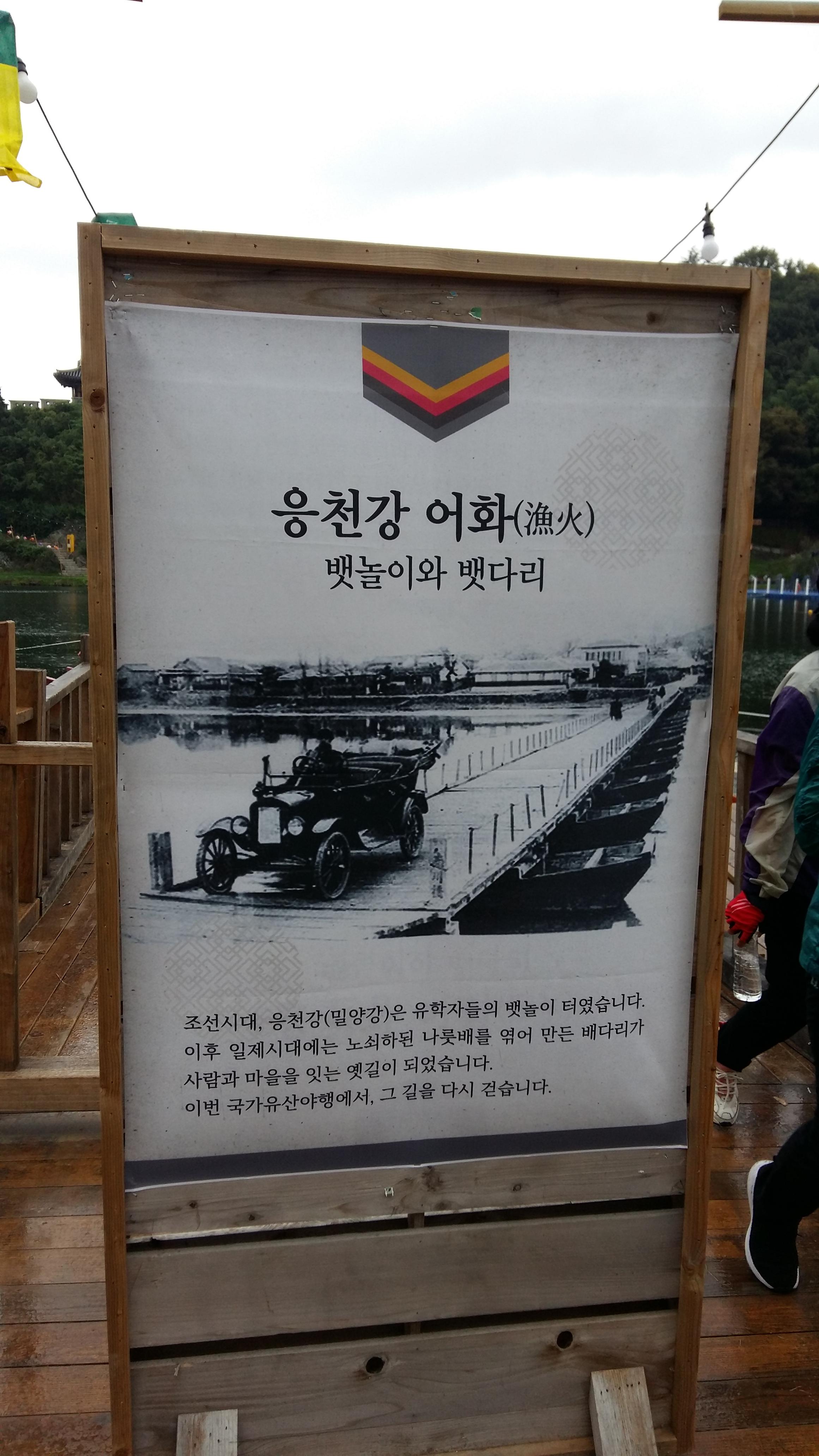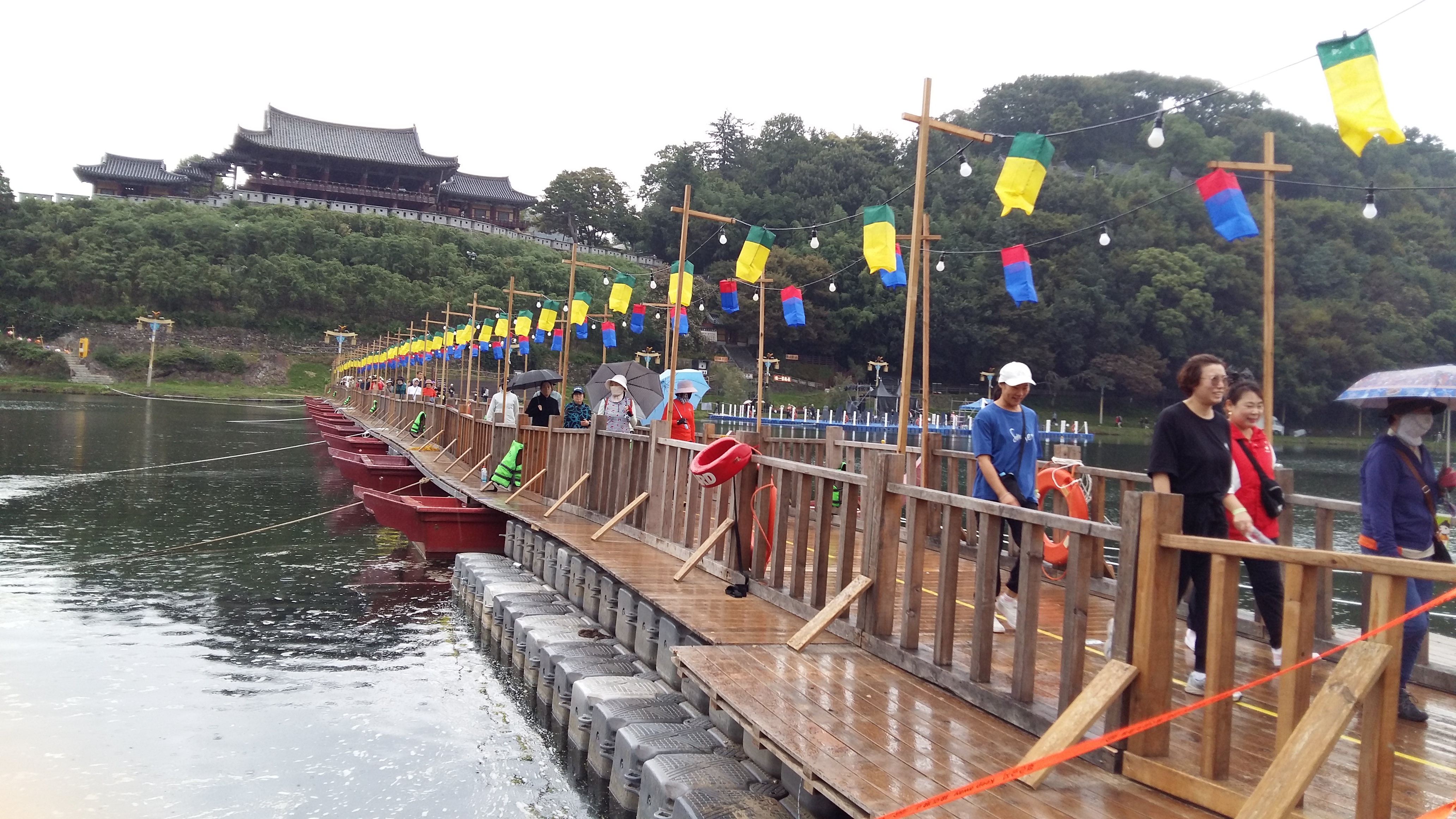 식전 행사를 마치고 출발하였다. 용평교를 지나면서부터 안개비가 내리더니 밀양강에 임시로 가설한 배다리를 건너 마무리할 때까지 밀양강 위로 내리는 비가 동심원을 무수히 그리고 있지만, 체감상으로는 그렇게 피할 정도의 비는 아니다.